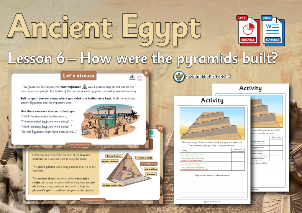 This editable lesson pack focuses on the different theories historians have of how the pyramids were built. The file includes