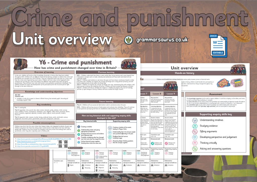 This editable knowledge organiser accompanies our Year 6 ‘Crime and Punishment’ unit lessons. The file includes the following resources: -