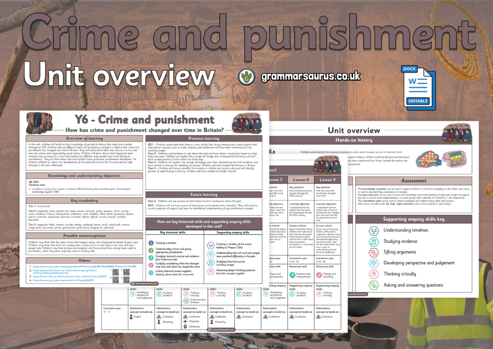 This editable unit overview offers a medium-term plan for Year 6's ‘Crime and Punishment’ topic. The file includes the following