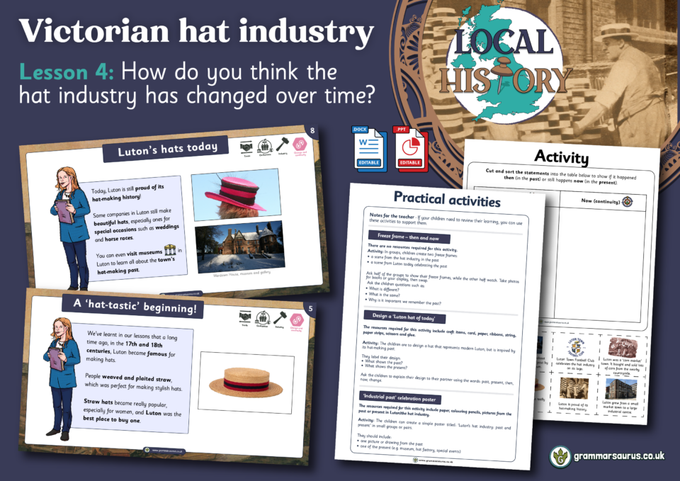 This editable lesson pack focuses on how the Luton Hat industry has changed over time.The file includes the following resources:-