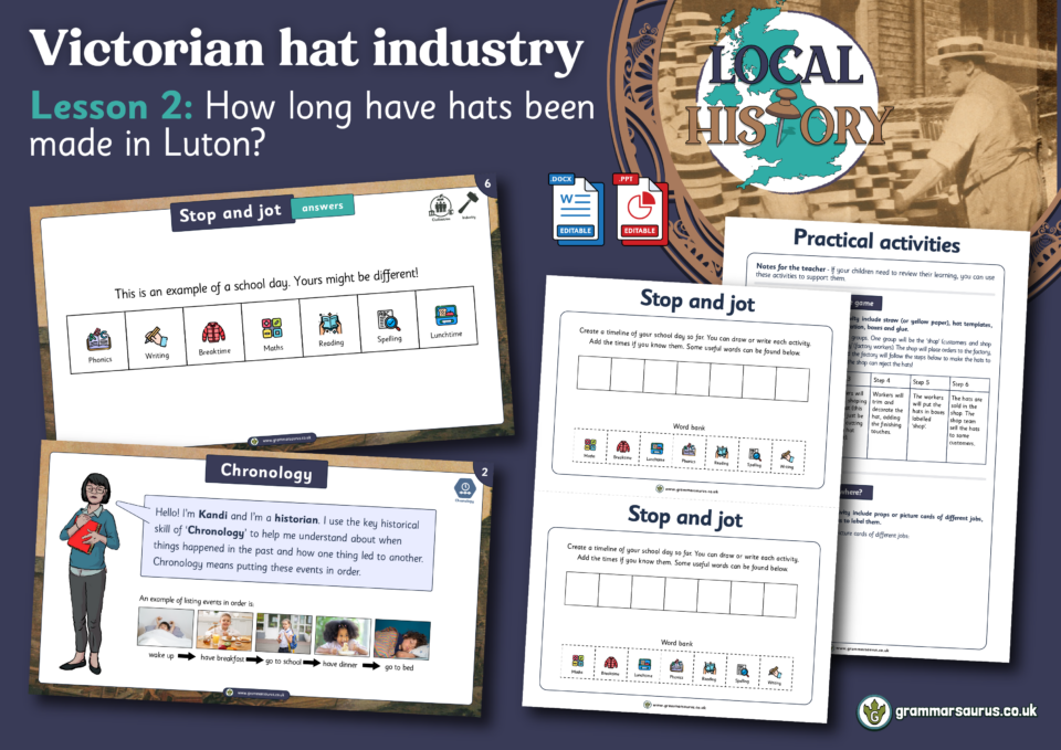 This editable lesson pack focuses on ordering the most important events in the Luton hat industry.The file includes the following