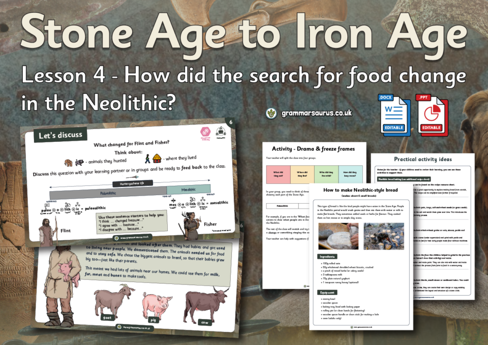 This editable lesson pack focuses on what Palaeolithic and Mesolithic people ate. The file includes the following resources: - editable