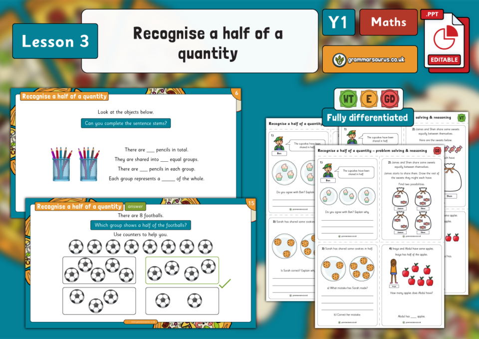In this lesson, children will learn to recognise a half of quantity understanding objects must be shared equally between 2