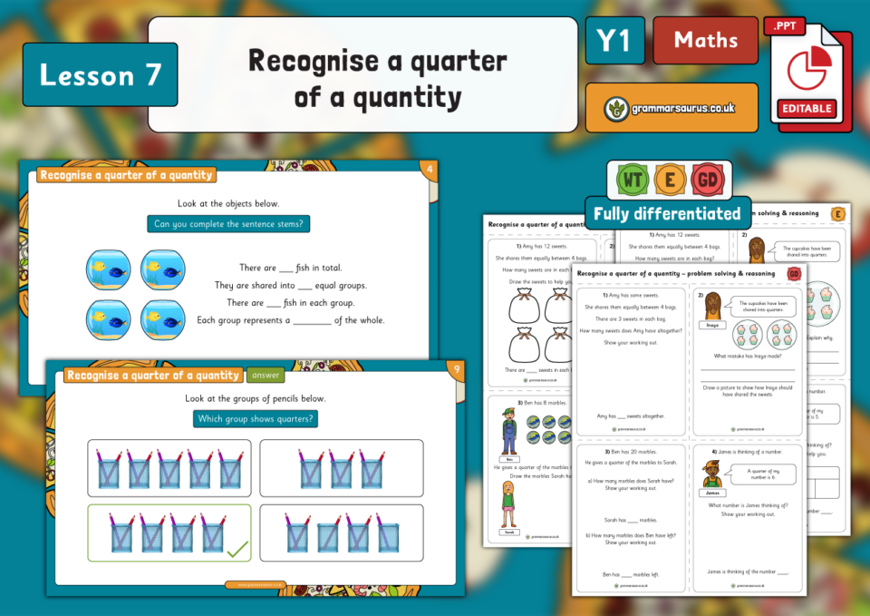 In this lesson, children will learn to recognise a quarter of a quantity understanding objects must be shared equally between