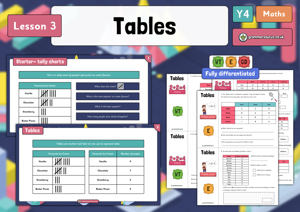 In this lesson, children solve comparison, sum and difference problems using pictograms, tables and bar charts. They will use addition