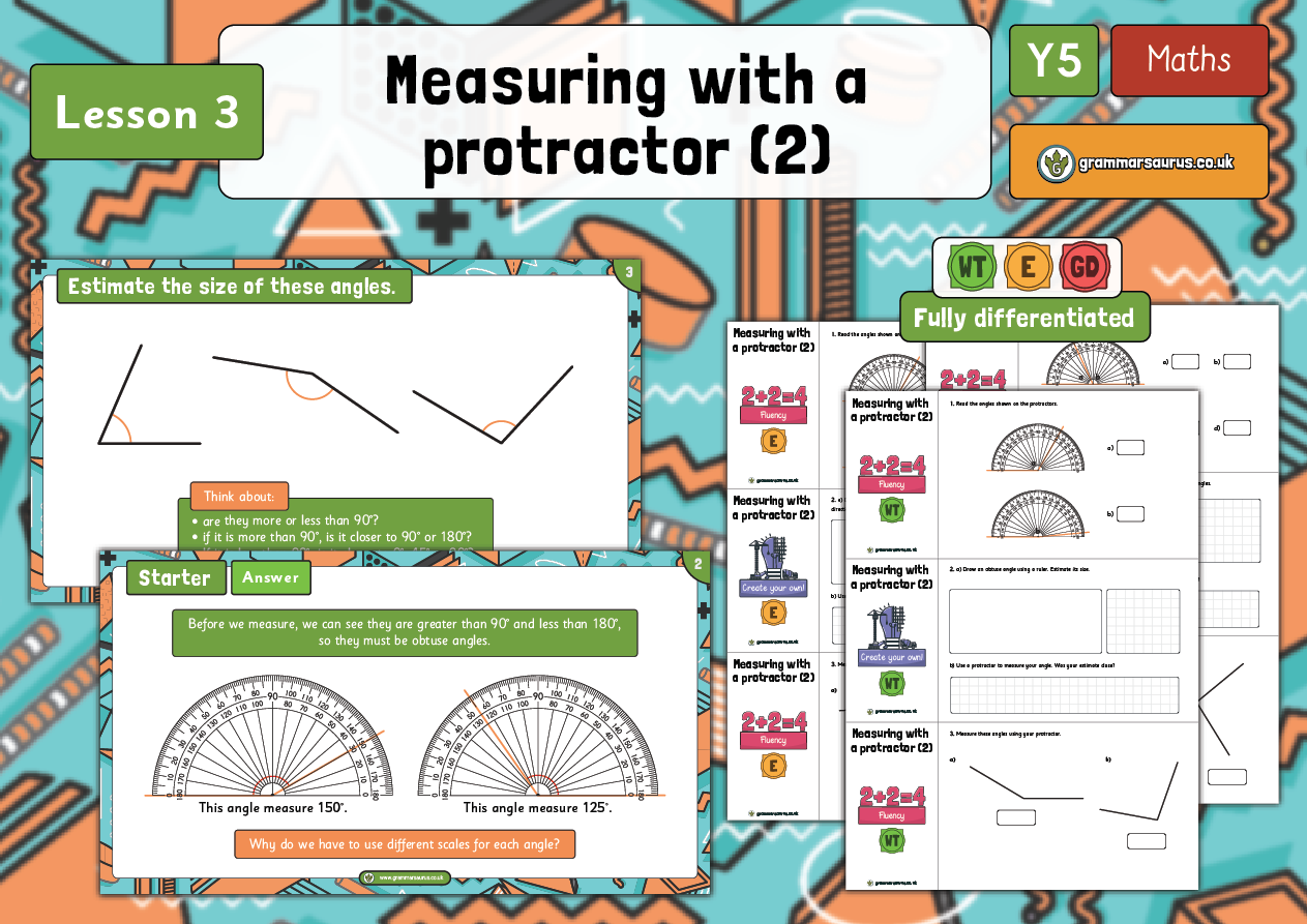In this lesson, children measure angles up to 180° using a protractor. They measure angles where the protractor is placed