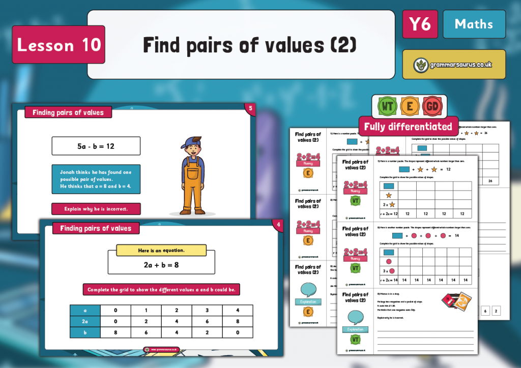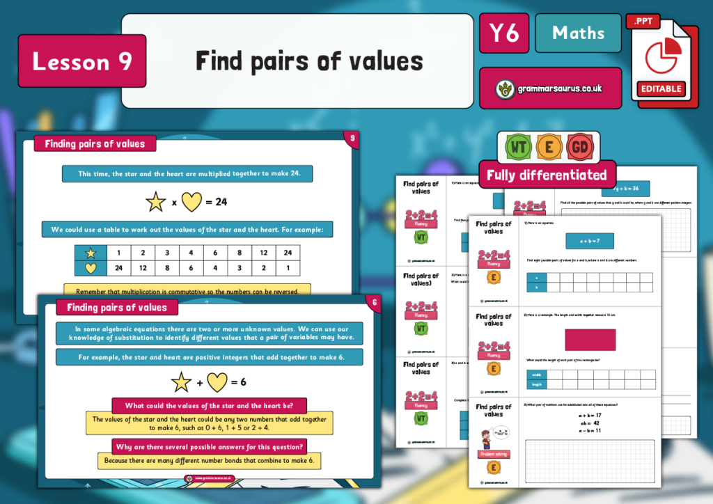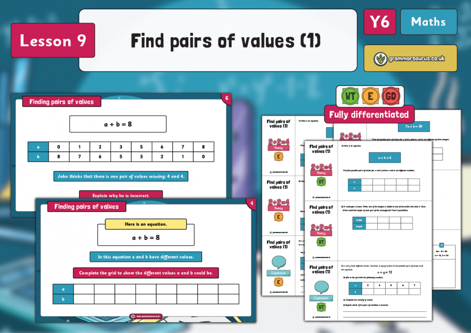 Year 6 Algebra – Find pairs of values – Lesson 9
