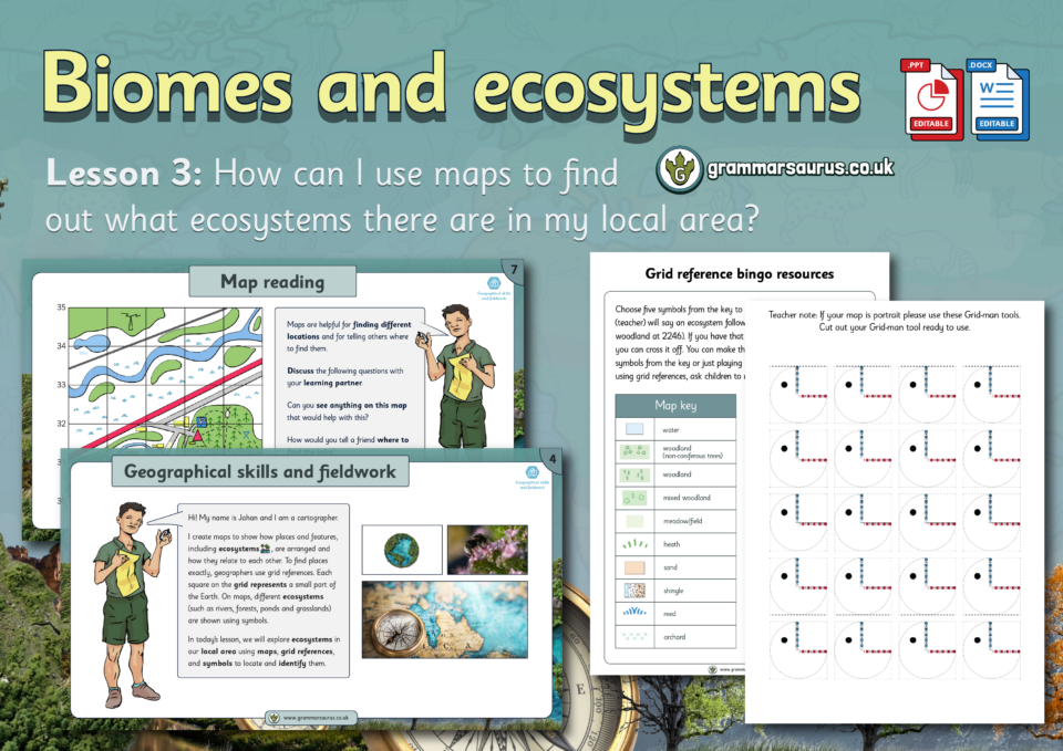 This adapted geography lesson focuses on using four-figure grid references to locate ecosystems on a map. Children will focus on
