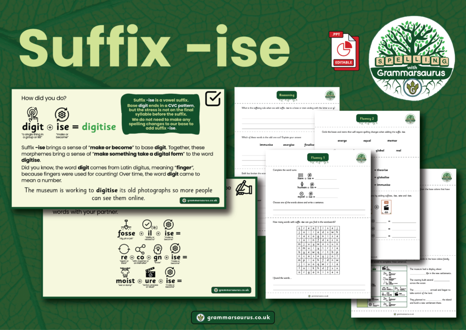 In this objective, children will learn how to add the suffix -ise to bases and stems. Over three 20-minute lessons,