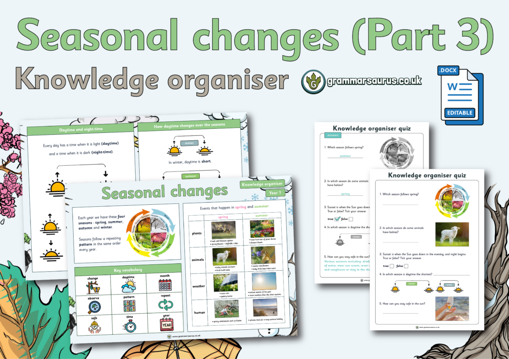 This resource is a Year 1 knowledge organiser on the topic Seasonal changes. It includes a knowledge organiser and mini