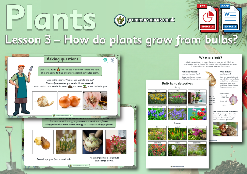 This editable differentiated lesson pack focuses on how plants grow from bulbs. Children explore real bulbs or photographs, ask their own