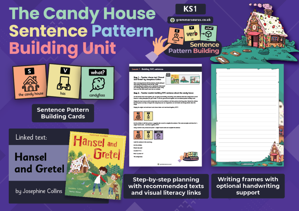 This Sentence Pattern Building Unit is based on the book 'Hansel and Gretel' by Josephine Collins. Unit guide Grammarsaurus unit