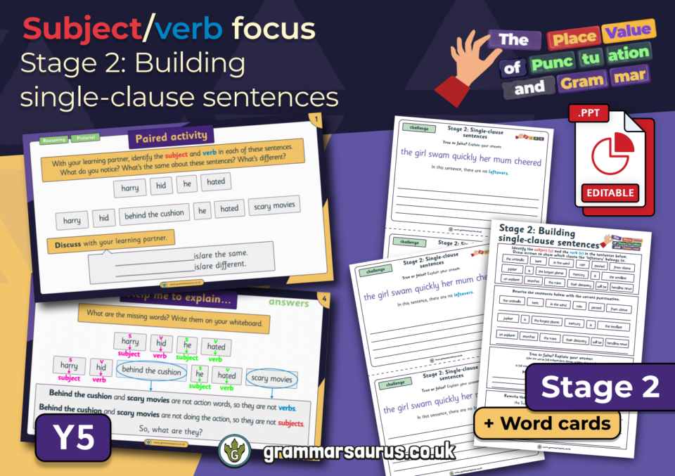 Year 5 The Place Value of Punctuation and Grammar – Subject/Verb focus – Building single-clause sentences – Stage 1 (Objective 11 of 19)