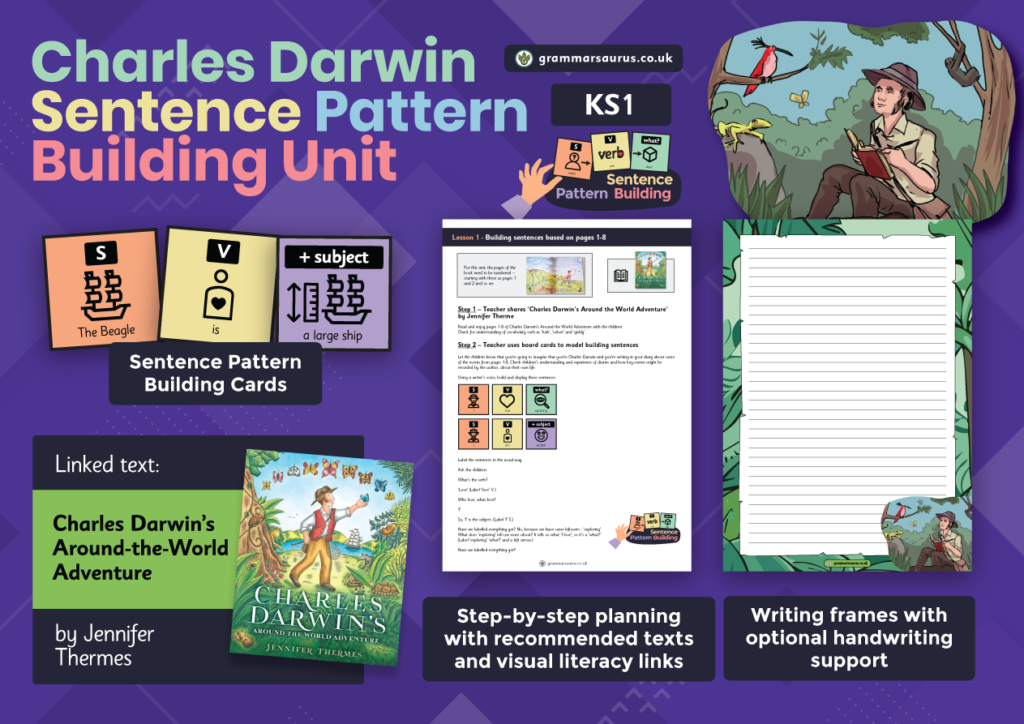 This Sentence Pattern Building Unit is based on the book 'Charles Darwin's Around-the-World Adventure’ by Jennifer Thermes. Unit guide Grammarsaurus