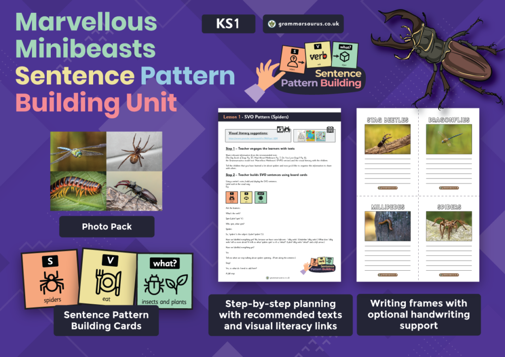 This Sentence Pattern Building Unit is based on the topic of minibeasts. Unit guideGrammarsaurus unit guides are designed to support