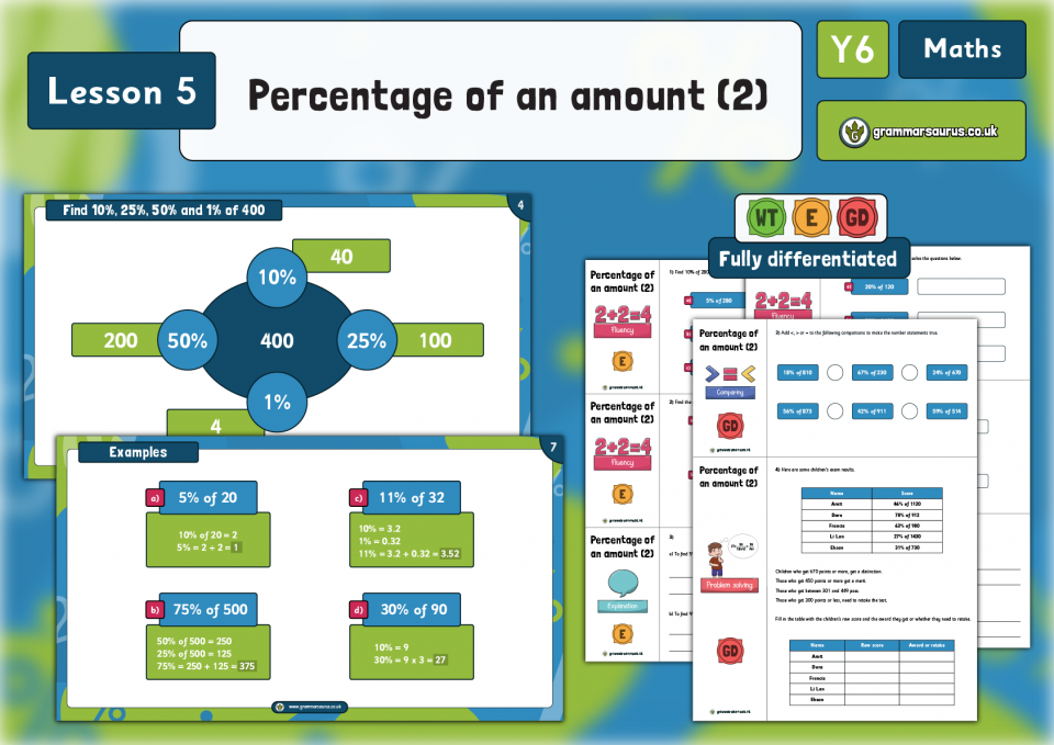 Year 6 Fractions, Decimals and Percentages – Percentage of an amount – one step – Lesson 7
