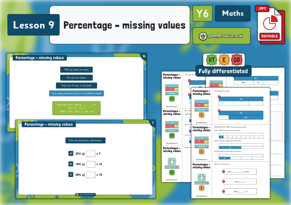 Year 6 Fractions, Decimals and Percentages – Percentage – missing values – Lesson 9
