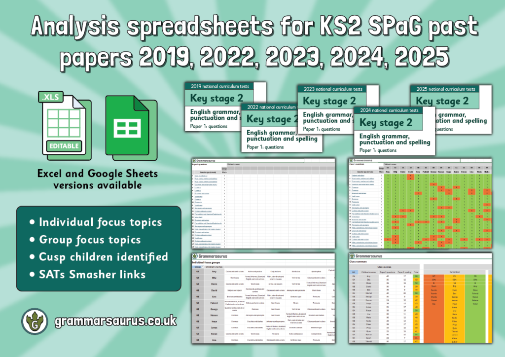 Analysis spreadsheets for KS2 SPaG past papers 2019, 2022, 2023, 2024, 2025