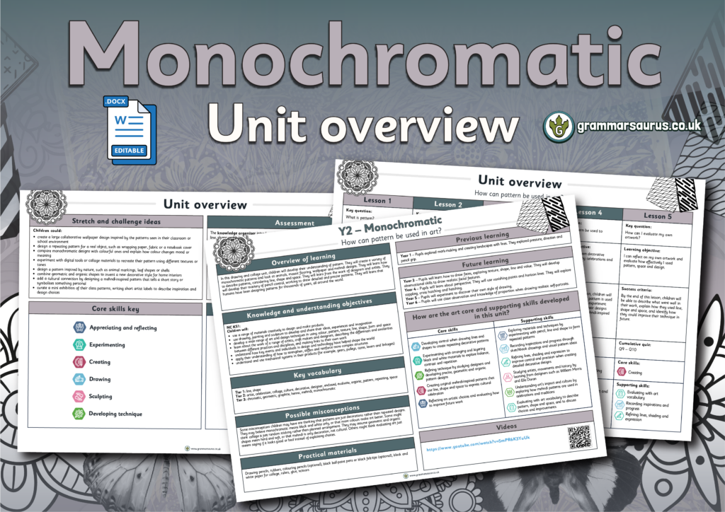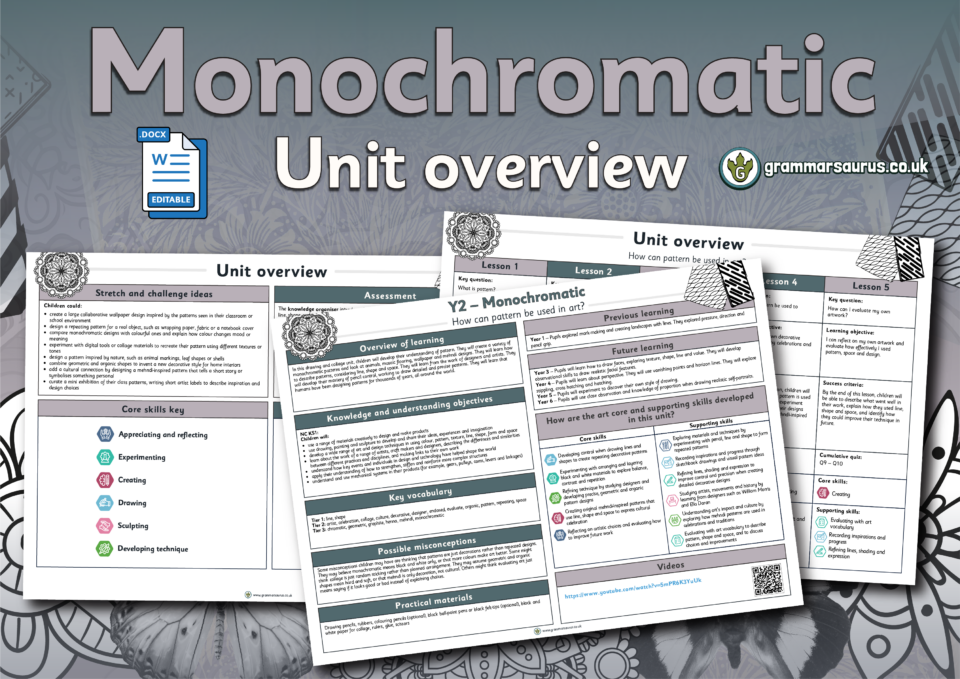 This editable unit overview offers a medium-term plan for Year 2's ‘Monochromatic’ art topic. The file includes the following resources: