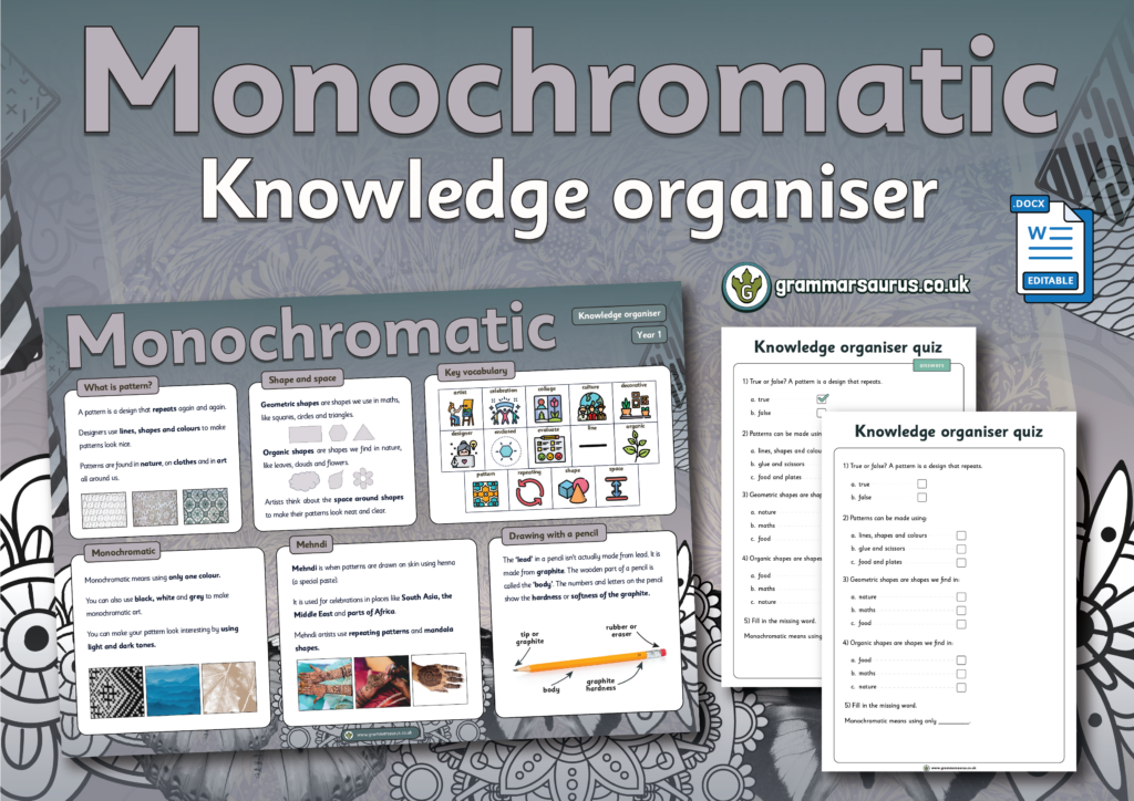 This editable knowledge organiser accompanies our Year 2 ‘Monochromatic’ unit lessons. The file includes the following resources: - editable knowledge
