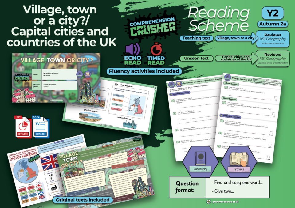 Year 2 Comprehension Crusher Reading Scheme – Autumn 2a – Village, town or a city?/Capital cities and countries of the UK