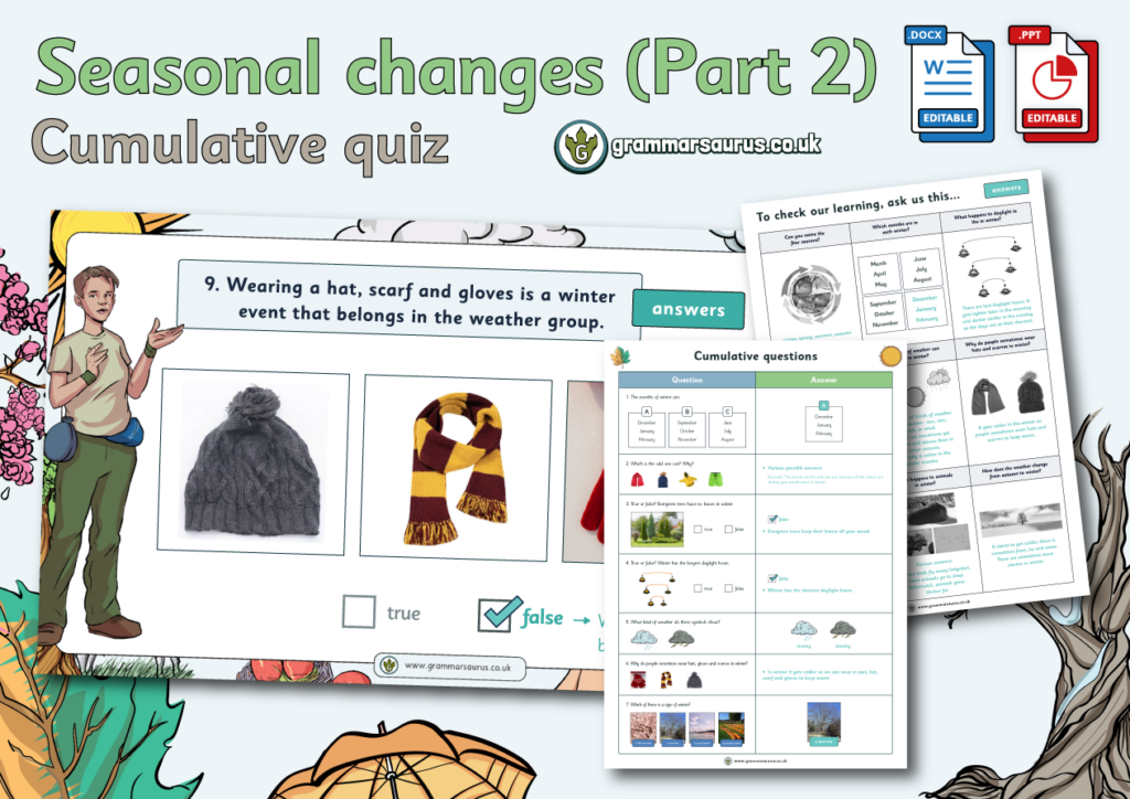 This cumulative quiz is designed to assess children’s understanding of PART 2 of the Year 1 Seasonal changes unit (autumn) which includes