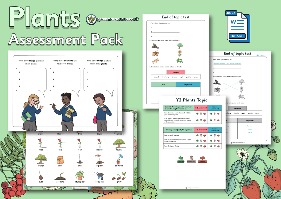 This editable assessment pack is an addition to the rest of the Y2 plants lesson packs. It includes: -topic front cover to