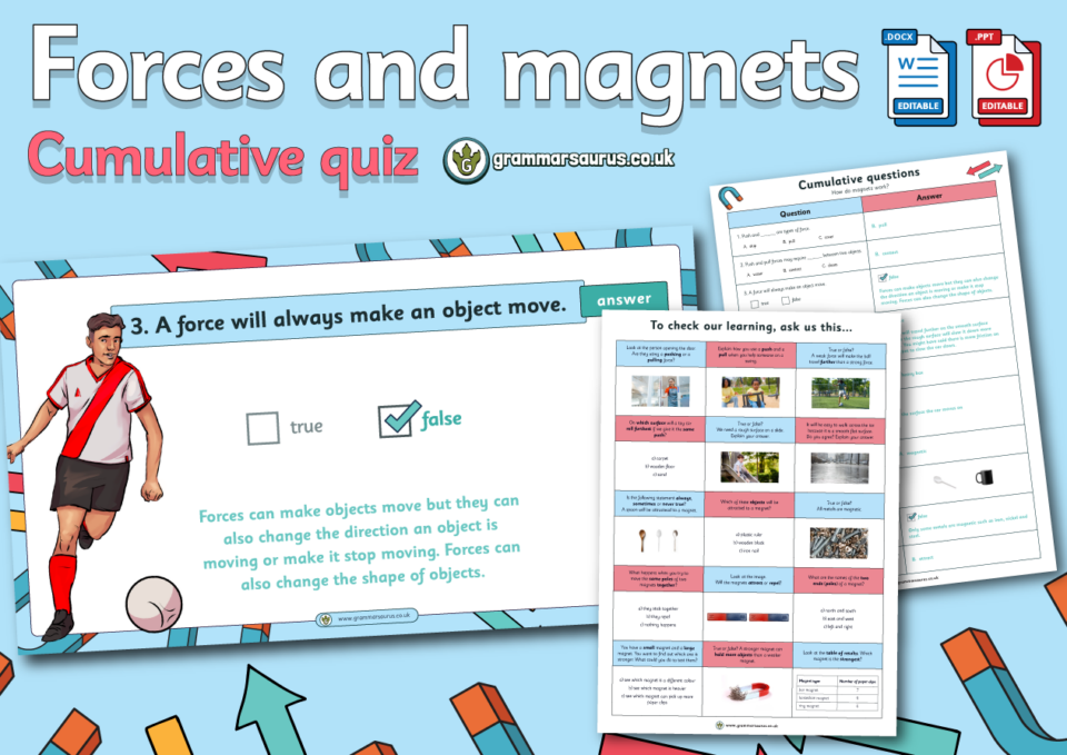 Teachers can use this cumulative quiz and the questions to assess children throughout the Year 3 Forces and magnets unit.