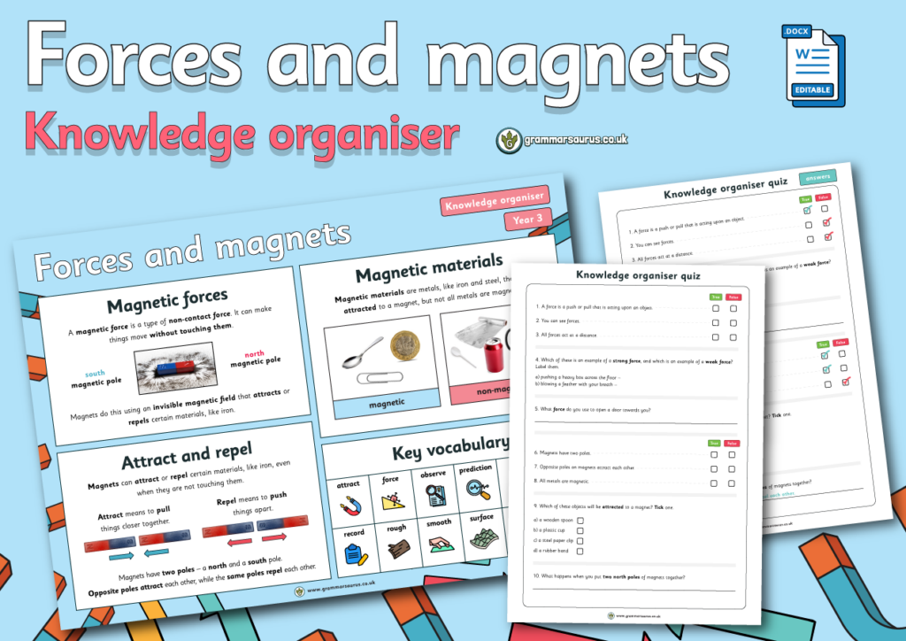 This editable knowledge organiser accompanies our Year3 Forces and magnets unit lessons. The file includes the following resources: -