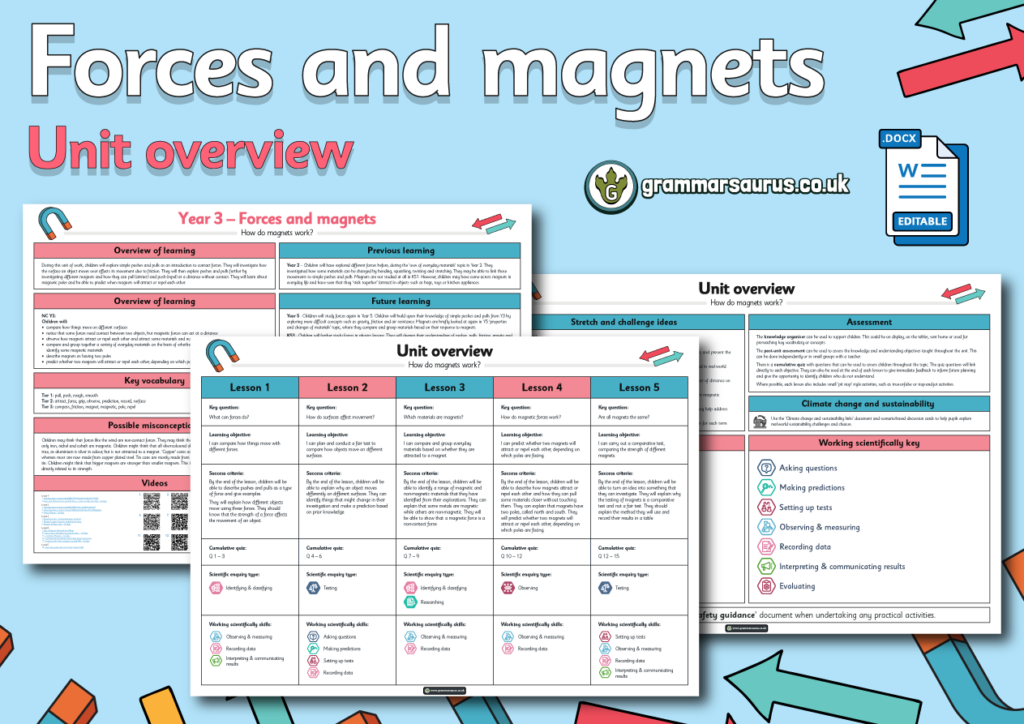 This editable unit overview offers a medium-term plan for Year 3's Forces and magnets topic. The file includes the following resources:– links