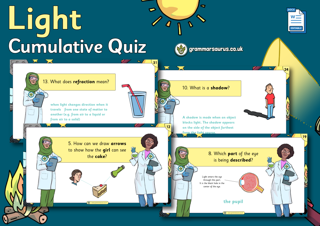 This is a cumulative quiz with questions that can be used to assess children throughout the Y6 Light topic. The quiz questions
